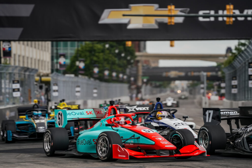 DETROIT (2 June 2024) – At the end of a chaotic 500th INDY NXT by Firestone series race, ABEL Motorsports had retained the points lead and posted solid runs with both team entries in Sunday’s 45-lap Grand Prix of Detroit.
